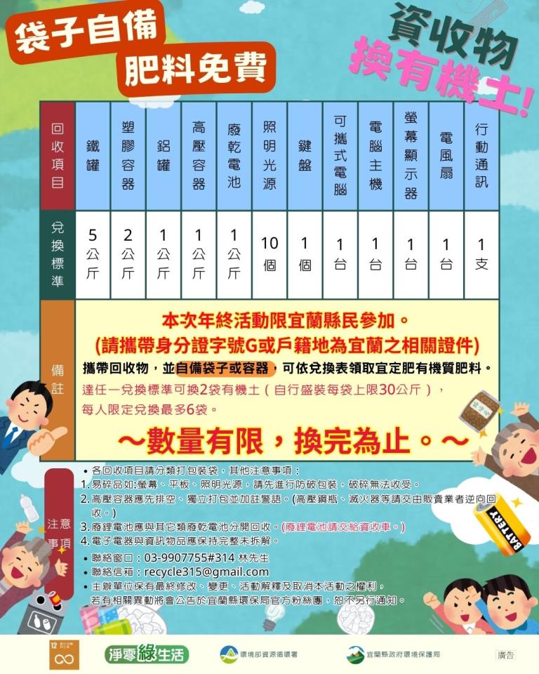 宜蘭縣環保局因應縣內廚餘回收量提升及「宜定肥有機質肥料」產能充足,將於12月16日於環保局(大門口進來右轉直行至第一個空橋下)、12月24日於宜蘭運動公園(南側入口)辦理2場次「袋子自備,肥料免費」資源回收兌換活動(時間09:30-11:30,13:30-15:30),鼓勵民眾以實際行動支持資源回收。活動採「資源回收物兌換宜定肥有機質肥料,達任一兌換標準換2袋」、「每人最多6袋(自行盛裝每袋上限30公斤)」、「袋子須自行準備,現場不提供袋子。」、「以自行裝填。」方式辦理,兌換宜定肥有機質肥料為本縣廚餘再利用產品,品質安心、安全、友善環境。